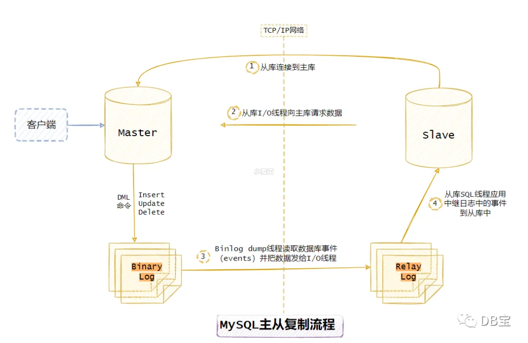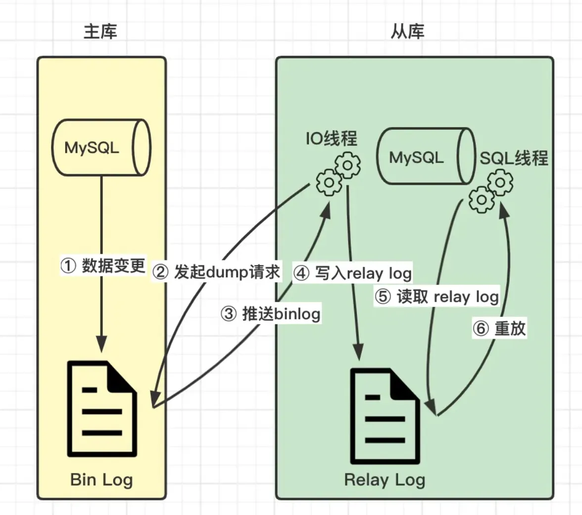 MySQL 从库开始复制时,会通过 IO 线程发起 dump 请求,等待主库推送 binlog,接收到之后,将该 binlog 写入 relaylog。通过 SQL 现成读取 relaylog,并执行这些 SQL。